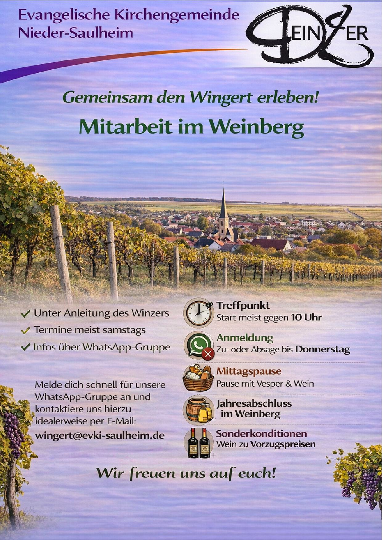 Nieder-Saulheim – Die Evangelische Kirchengemeinde Nieder-Saulheim lädt gemeinsam mit dem Weingut Deinzer zu einem besonderen Mitmachprojekt im Weinberg ein. Unter dem Motto „Gemeinsam den Wingert erleben!“ sind interessierte Bürgerinnen und Bürger eingeladen, im Laufe des Jahres bei verschiedenen Arbeiten im Weinberg mitzuhelfen und so einen Einblick in die traditionelle Weinbergsarbeit zu erhalten.