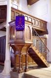 Betrachten wir die Kanzel näher, dann sehen wir, worum es in der Predigt gehen soll: Die fünf auf Holz gezeichneten Bilder stellen die vier Evangelisten und Christus dar. Rechts von Jesus finden wir die Evangelisten Lukas, Johannes und links von ihm Matthäus, Markus.